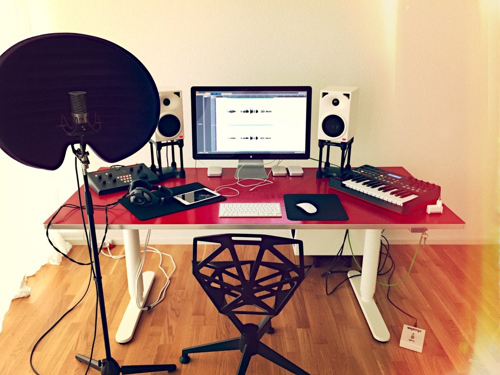 This is my Bitwig setup. SPL Crimson, Klein + Hummel O110 and 0800, Aston Halo and Origin, MIDI keyboard, MacBook Pro connected to an external display. That's it.