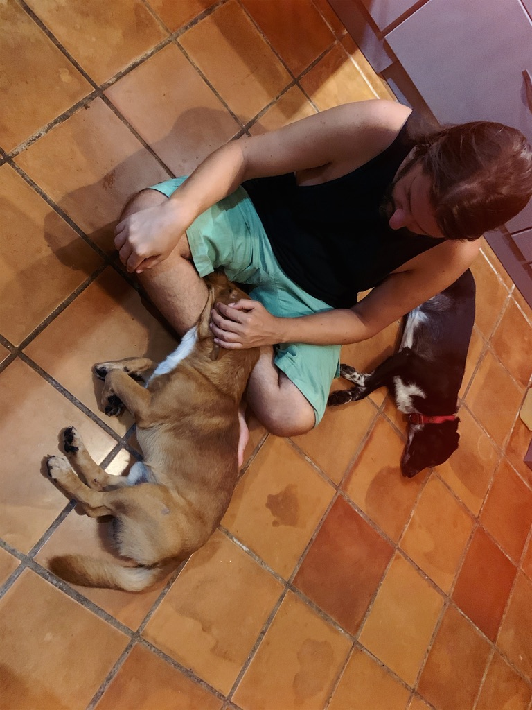 I was just sitting down on the floor to be closer to the dogs and a couple of moments later, the golden one was already sleeping on my leg like a baby. 🥰 #love #life #animals #friends #amadeuspaulussen #vegan #govegan